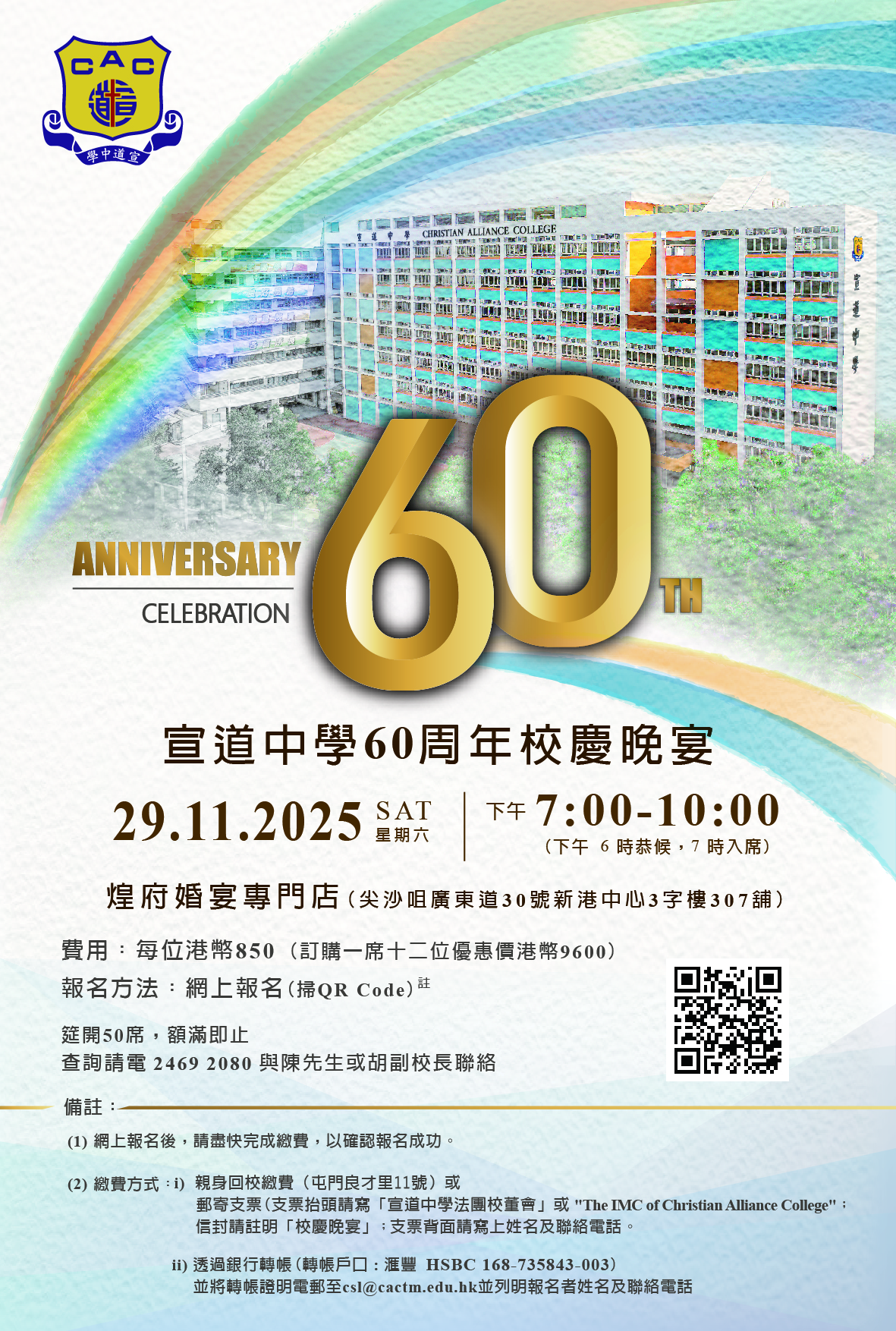 晚宴所得的報名餐費,扣除晚宴相關支出,如有盈餘將全數撥入學校「六十周年校慶籌款計劃」中的「宣道中學校園設施優化基金」及「宣道中學學術提升基金」之內。盼望大家能鼎力參與,支持學校持續發展,為學弟學妹締造更優質的學習環境。